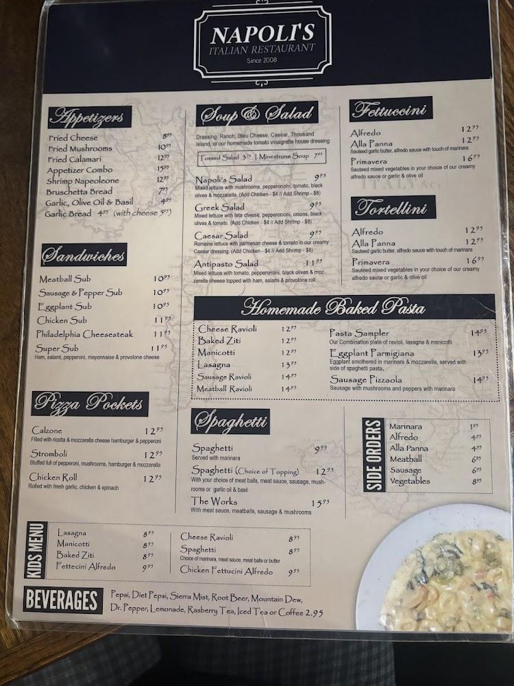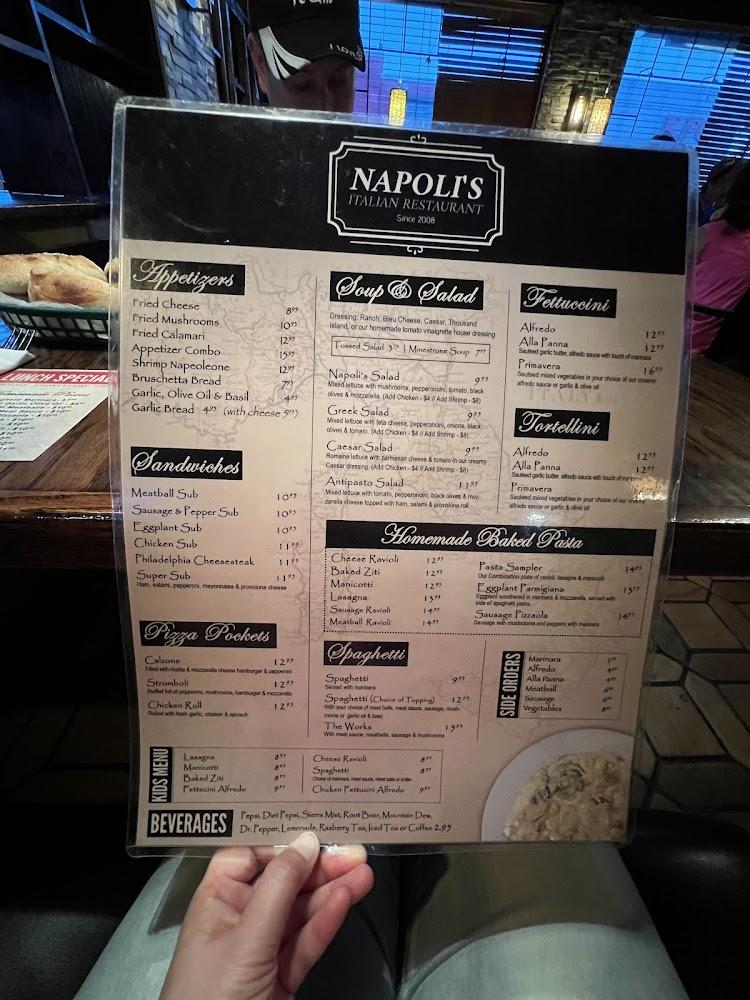 Napoli's menu showcases a blend of traditional Italian fare and unique specialties. It features over 89 plates, from classic spaghetti to innovative eggplant specials, ensuring something for every palate. Diners can choose from appetizers like fried calamari and cheesy bread, while the main courses include a range of pasta dishes, chicken entrees, seafood, and savory homemade baked pastas.